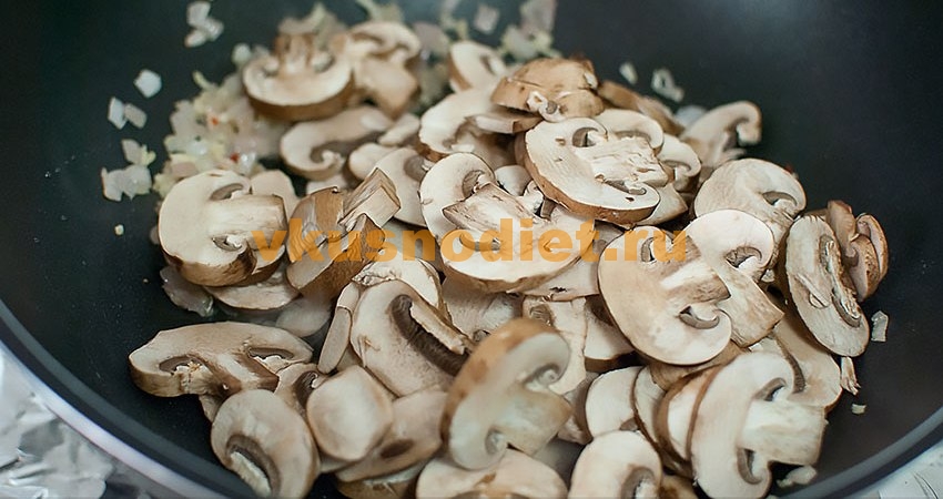 4. Шампиньоны тонко нарезаем продольными пластинками и выкладываем на лук. Хорошо прожариваем, периодически перемешивая.